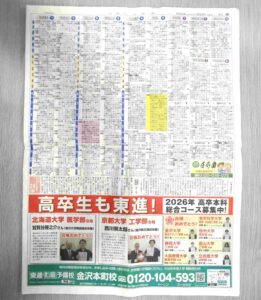 ここ数日は、毎日のように高卒生の問合せ、入学手続があります。 大変、感謝する次第です。 今日のトピックは、「北陸中日新聞のテレビ欄下に、金沢本町校の高卒生の合格者を9名掲載」です。 今年は、高卒生が続々と合格し、例年にな […]